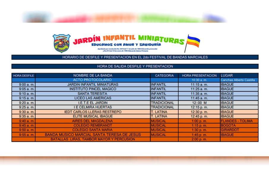 De igual forma la celebración arrancará desde la sede principal del colegio, ubicada en la manzana C casa 17 de la zona de Tolima Grande. Aquí, las bandas participantes se reunirán para iniciar un desfile que recorrerá aproximadamente 12 cuadras, llevando su música y su pasión por las bandas marciales a lo largo de un emocionante trayecto. Además, en la sede Jardín Infantil Miniaturas de la manzana 18 casa 18 en el barrio El Topacio, un jurado de recorrido evaluará el desempeño de las bandas a lo largo de la marcha.
