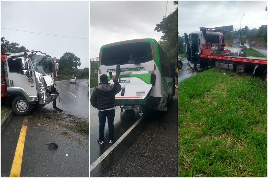 Algunos testigos afirman que el conductor del bus intermunicipal disminuyó su marcha, pero la grúa, que venía atrás, aparentemente no se percató y ocasionó el choque. Producto del impacto hubo un efecto rebote que por poco la catapulta al carril ascendente.