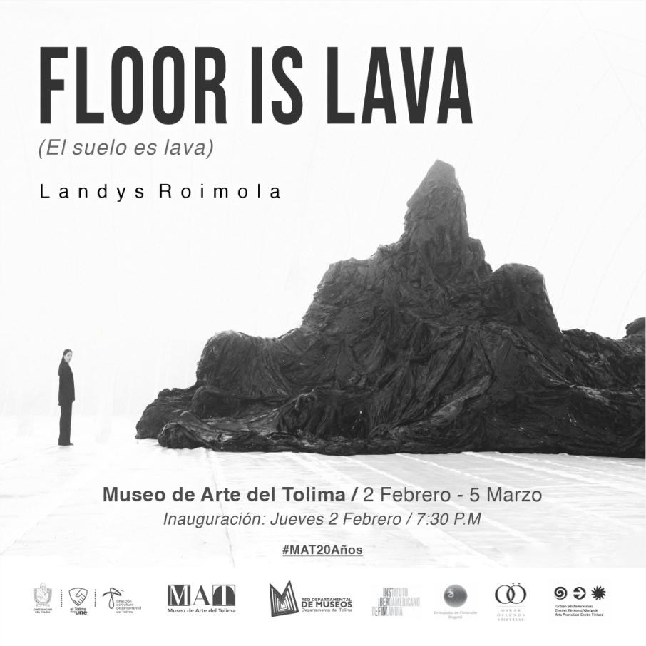 -Floor Is Lava (El Suelo Es Lava) de la artista colombo finlandesa Landys Roimola, quien desde el año 2018 ha canalizado su creciente preocupación en torno al cambio climático, la extinción en masa, la incertidumbre del futuro y el sentimiento de impotencia dándole forma a la serie de obras Floor is Lava (El suelo es lava). La instalación condensa estas emociones en una henchida masa negra que demanda al espectador a detenerse y contemplarla. Esta es la primera vez que la serie se exhibe en Colombia, y a la vez, es la primera exposición individual de la artista en su país de origen.