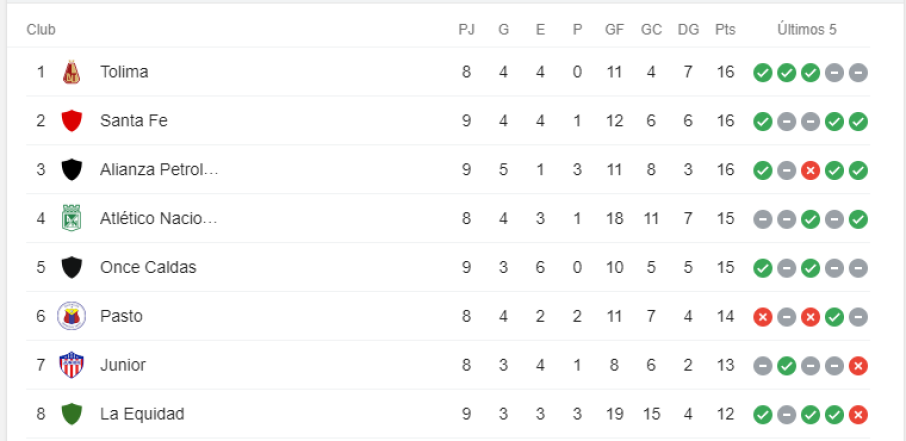 A falta del partido correspondiente a la fecha 9, Tolima se mantiene parcialmente en el primer lugar de la tabla de posiciones con 16 puntos, los mismos que tienen Santa Fe y Alianza Petrolera, quienes sí están al día con el calendario.