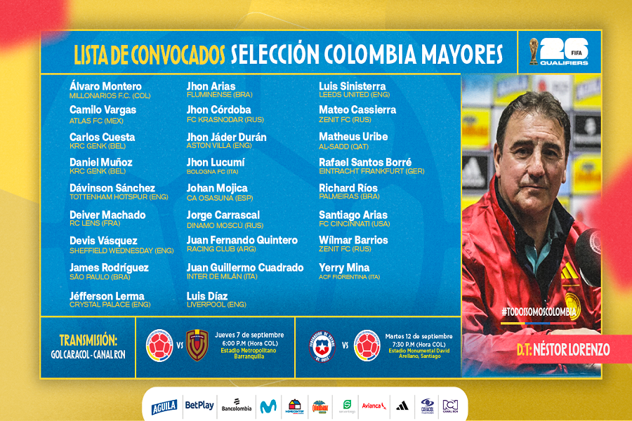El Departamento Deportivo de la Federación Colombiana de Fútbol – FCF y el cuerpo técnico de la Selección Colombia de Mayores, que es liderado por el director técnico Néstor Lorenzo, se permiten informar la lista de jugadores convocados para los partidos correspondientes a las fechas 1 y 2 de las Clasificatorias Conmebol, para la Copa Mundial de la FIFA™ 2026, en donde la Selección Nacional enfrentará a sus similares de Venezuela en Barranquilla y Chile en Santiago.