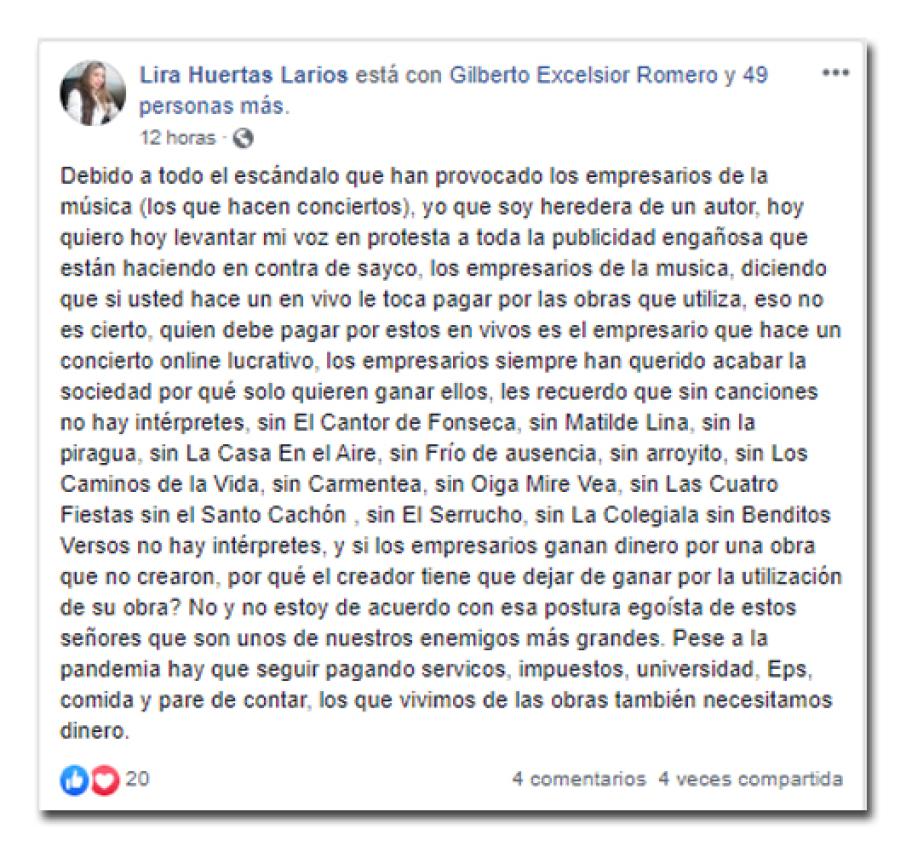 Lira Huertas Larios - Hija del cantor de Fonseca escrbió: "quien debe pagar por estos en vivos es el empresario que hace un concierto online lucrativo, los empresarios siempre han querido acabar la sociedad por qué solo quieren ganar ellos, les recuerdo que sin canciones no hay intérpretes, sin El Cantor de Fonseca, sin Matilde Lina, sin la piragua, sin La Casa En el Aire, sin Frío de ausencia, sin arroyito, sin Los Caminos de la Vida, sin Carmentea, sin Oiga Mire Vea, sin Las Cuatro Fiestas sin el Santo Cachón , sin El Serrucho, sin La Colegiala sin Benditos Versos no hay intérpretes, y si los empresarios ganan dinero por una obra que no crearon, por qué el creador tiene que dejar de ganar por la utilización de su obra?"