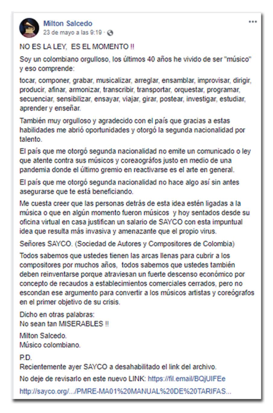 Milton Salcedo, pianista, director y productor musical afirmó: "Me cuesta creer que las personas detrás de esta idea estén ligadas a la música o que en algún momento fueron músicos y hoy sentados desde su oficina virtual en casa justifican un salario de SAYCO con esta impuntual idea que resulta más invasiva y amenazante que el propio virus."