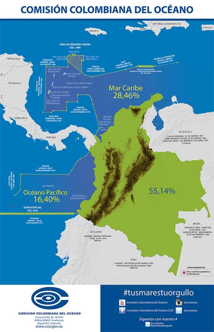 Las cifras también hablan por sí solas. El 16,4% del área de Colombia corresponde al Océano Pacífico, 28,46% al mar Caribe y 55,14% a su extensión en tierra. Es decir, el 44,86% de Colombia es mar. Esa es una de las razones por las que la CCO intenta difundir cada vez más el mapa de Colombia donde los mares adquieren el reconocimiento que se les había arrebatado.