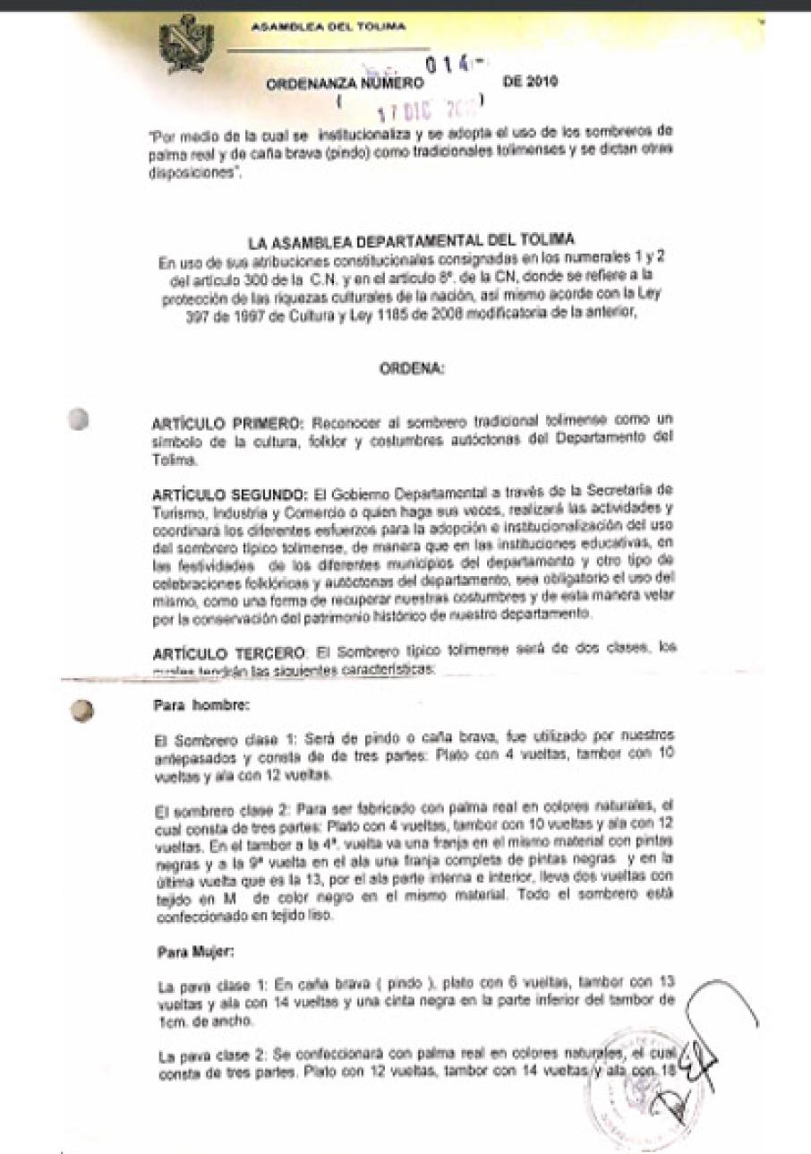 En la Ordenanza se decretaron las características que debería tener cada uno de los sombreros, de hombre y de mujer, de pindo y de palma real para ser considerados como auténticos tolimenses.