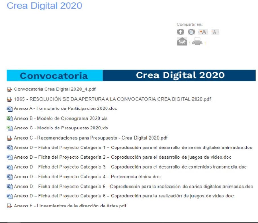 Desde el año 2012 a la fecha, los Ministerios de Cultura y Ministerio de Tecnologías de la Información y las Comunicaciones han venido desarrollando la convocatoria Crea Digital, con el fin de buscar micro, pequeñas y medianas empresas del sector de las industrias digitales creativas y culturales, las nuevas tecnologías de la información y las comunicaciones, el desarrollo de software, la producción de contenidos interactivos o la comunicación en todas sus acepciones, para adelantar la coproducción de contenidos digitales con potencial comercial y énfasis cultural y/o educativo, con una narrativa dirigida al entretenimiento, para el fomento de la cultura, la lectoescritura y la apropiación de las tecnologías de la información y las comunicaciones, en las categorías de series de animación, juegos de video, transmedia, libros digitales interactivos (e-books), entre otras.