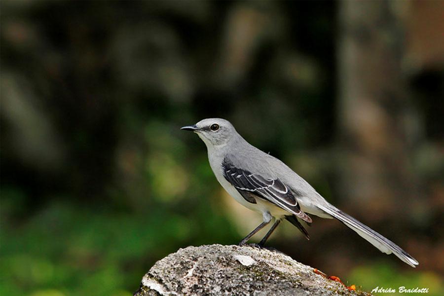 De ojos amarillos, cabeza y espalda de color gris, la parte inferior es de color blancuzco y sus alas negruzcas con dos franjas blancas al igual que sus bordes. Los adultos miden 25 cm y pesan 54 g. Su cola es larga y oscura de puntas blancas. El pico es delgado curvado y negro con curvatura ligeramente hacia abajo, las patas son largas y oscuras. Machos y hembras son similares