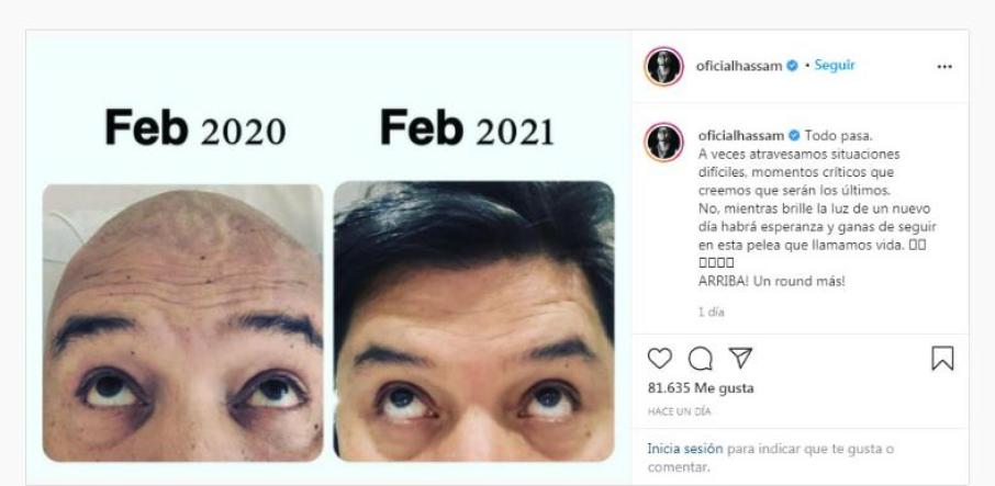 El humorista reflexionó sobre la vida en su cuenta de instagram, motivando a sus seguidores a seguir luchando, con una emotiva imagen donde hace una comparación del mes de febrero del 2020 al actual, por supuesto sus más de 2 millones de seguidores en el mundo, destacaron su valiosa lucha y el no haber perdido el sentido del humor que siempre lo caracteriza durante esta fuerte episodio que marcó su vida.