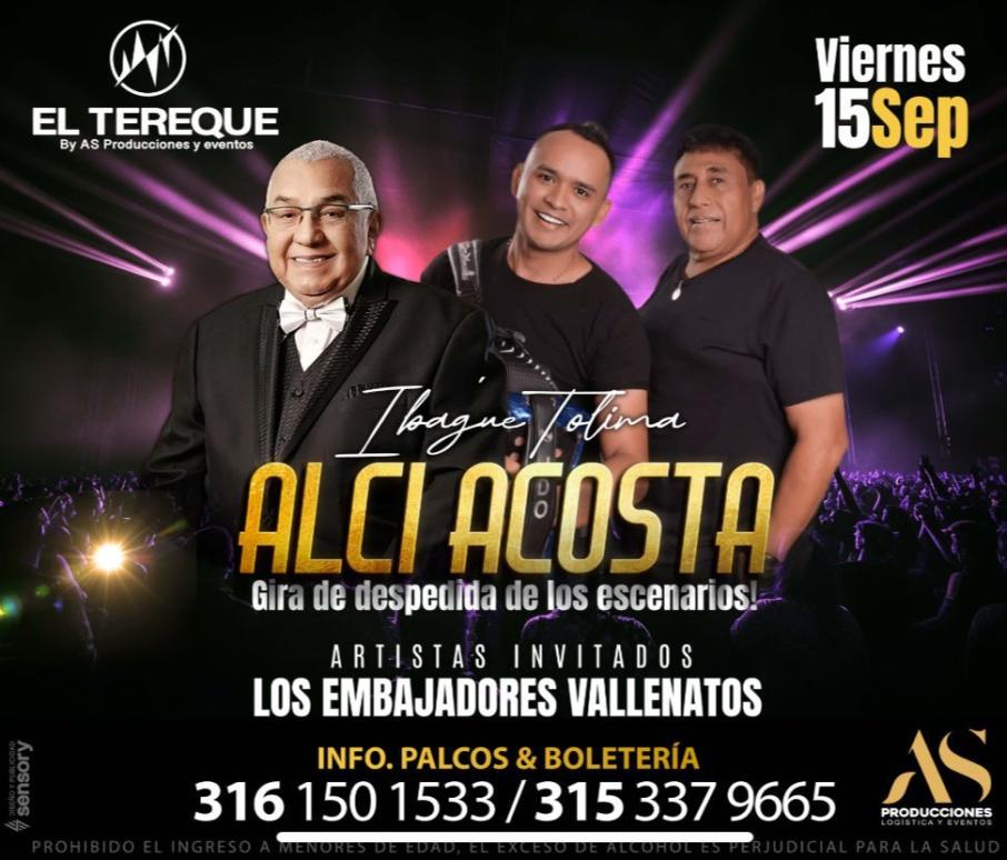Gracias a la organización de eventos que realiza AS Producciones, este viernes, 15 de septiembre, el icónico Alci Acosta se despide de los escenarios, marcando el final de una carrera legendaria, y realizará su último concierto en Ibagué.