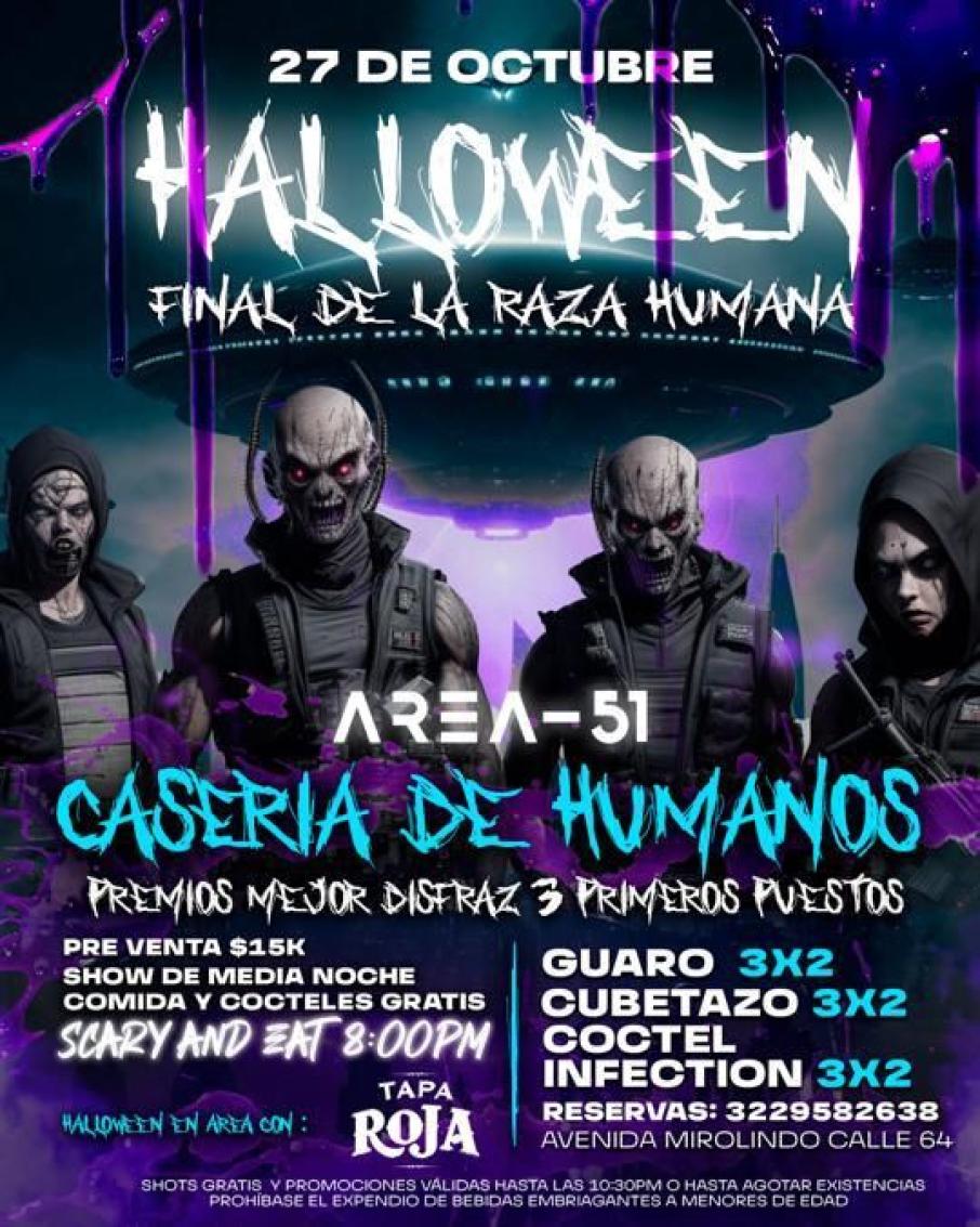 “Los invitamos a celebrar el próximo 27 de octubre en la discoteca Área-51, ubicada en la Avenida Mirolindo con calle 64, la fiesta de Halloween con su temática “Final de la raza humana” en donde se premiarán los tres mejores disfraces y contará con un show de media noche, comida y cocteles para todo el público”, indicó la marca.