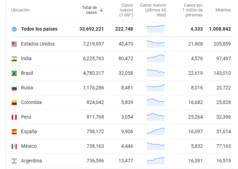 Simultáneamente, Colombia evidencia un ascenso paulatino que lo ubica en el quinto lugar del escalafón de países con mayor cantidad de personas que se han visto afectadas por el virus. Estados Unidos, India, Brasil y Rusia ocupan los cuatro primeros puestos.