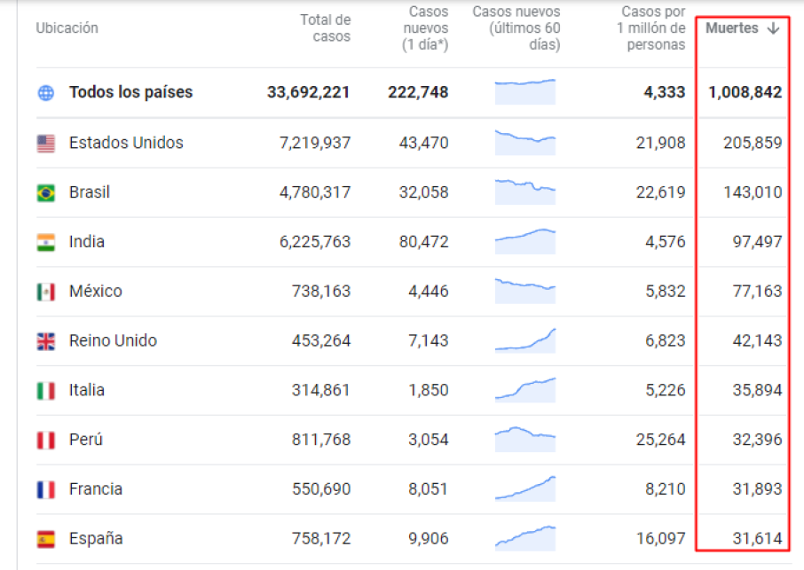 Respecto a la tabla de ciudadanos fallecidos a raíz del COVID-19, Colombia también ha ido escalando posiciones, pero hasta el momento se mantiene distante de los puestos más críticos. Estados Unidos Brasil e India puntean el indicador. Perú es el segundo país sudamericano con más víctimas, y le siguen Colombia (25.828) , Chile (12.725) y Ecuador (11.312).