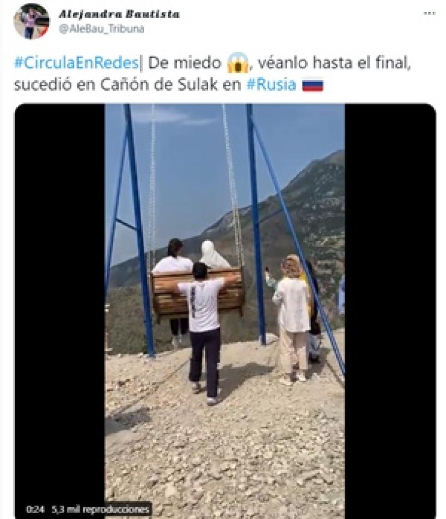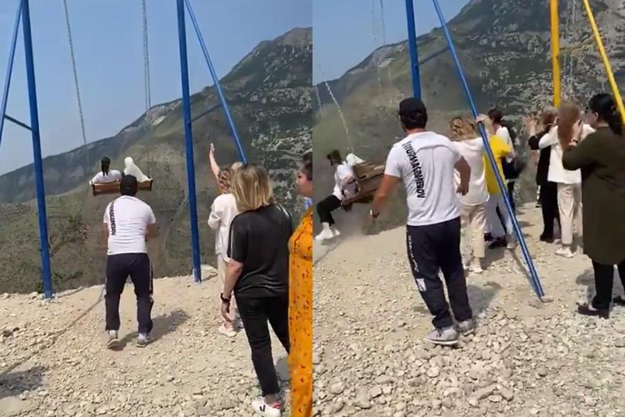A través de redes circula un video que muestra el momento en que las mujeres son balanceadas a 1.500 metros de altura en un columpio mirador ubicado en el cañón de Sulak (Daguestán, Rusia).