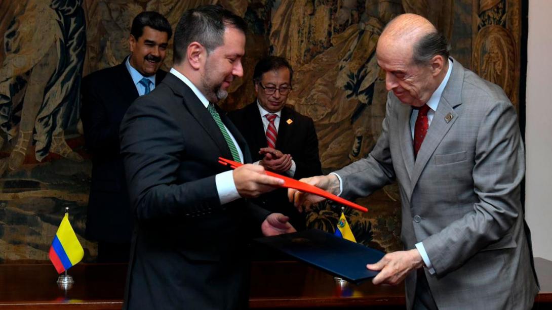 El canciller Álvaro Leyva y su homólogo venezolano, Yván Gil, firmaron este instrumento a través del cual Colombia y Venezuela trabajarán en adelante todos los temas bilaterales.