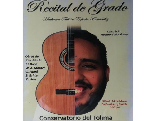 Contenido multimedia principal Prográmese este fin de semana con el Conservatorio del Tolima El músico Anderson España presentará un recital muy especial en el cual se partirá de la música clásica hasta llegar a la música moderna, la presentac...