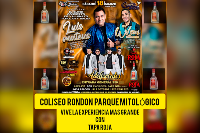Contenido multimedia principal El Espinal celebra ‘gran concierto del Día de la Mujer’ con Aguardiente Tapa Roja El show musical contará con la participación de Luis Mateus por primera vez en El Espinal, Los Adolescentes de Venezuela y Wilson Calderón.