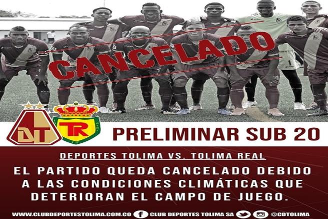 Contenido multimedia principal Atención: Se canceló partido del Deportes Tolima sub-20 El partido preliminar que se tenía pactado entre el Deportes Tolima sub-20 y el Tolima Real, previo a lo que sería el partido del cuadro pijao frente ...