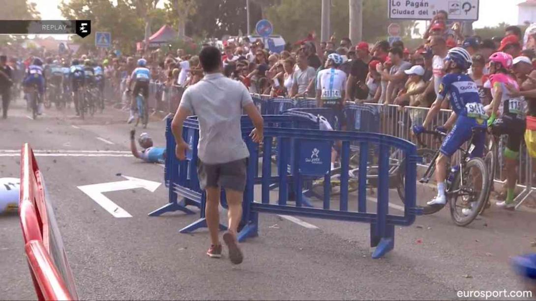 Luego de que los ciclistas recorrieran 150,7 kilómetros entre la localidad almeriense de Huércal-Overa y San Javier (Mar Menor), en la Región de Murcia, llegaron a la meta. Tranquilos pusieron un paso suave para buscar el bus de cada equipo, sin embargo, en ese momento un helicóptero voló muy bajo y generó unas fuertes corrientes de viento que terminaron moviendo unas barreras de metal hacia la carretera y tumbando a algunos corredores.