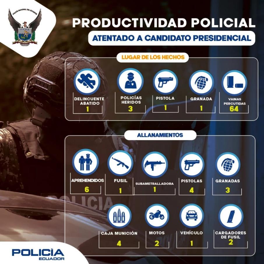 "La Policía Nacional del Ecuador ya tiene las primeras capturas de los presuntos autores materiales de este execrable hecho y empleará toda su capacidad operativa e investigativa a fin de poder esclarecer el móvil de este crimen y los actores intelectuales", señaló Zapata.