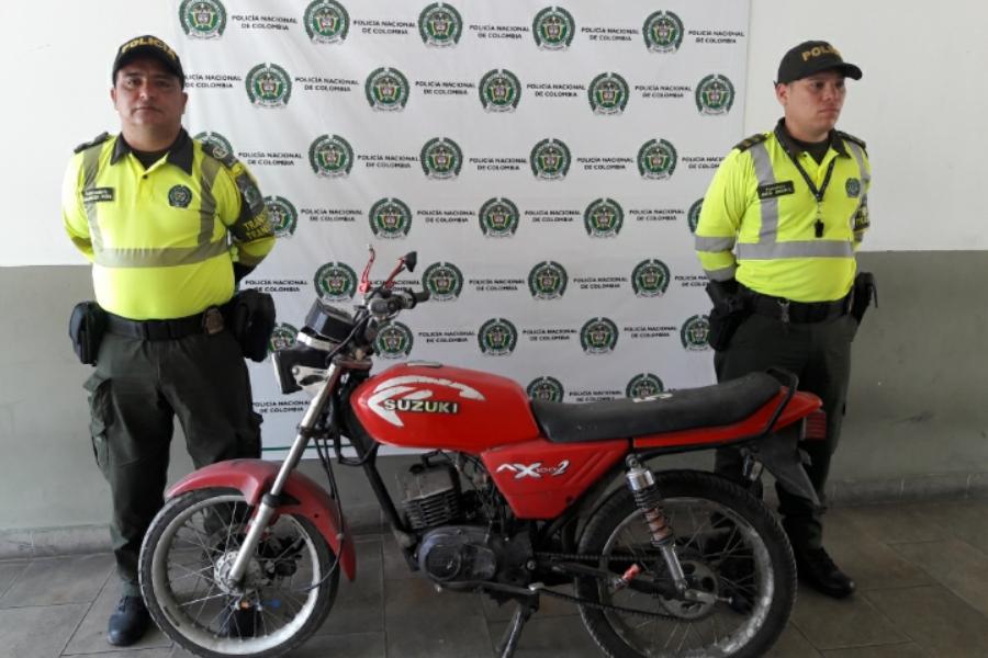 Mediante labores de patrullaje ejecutadas por integrantes del Modelo Nacional de Vigilancia Comunitaria por Cuadrantes de la Policía departamental, en las últimas horas en la manzana K del barrio Villa Catalina del municipio el Espinal se logró la ubicación de un vehículo tipo motocicleta, la cual estaba estacionada en la vía pública sin su conductor o propietario.