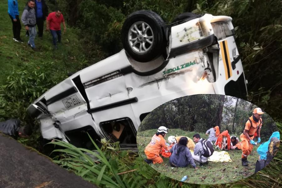 El delicado accidente de tránsito se presentó sobre las 7 de la mañana en el sector conocido como 'María Mocos' o La Herradura, ubicado entre el municipio de Cajamarca (Tolima) y Calarcá (Quindío), cerca al Alto de la Línea, donde un vehículo tipo vans de placas TGT-427 y adscrito a la empresa Páez Tours, terminó volcándose fuera de la carretera por circunstancias que son materia investigación.