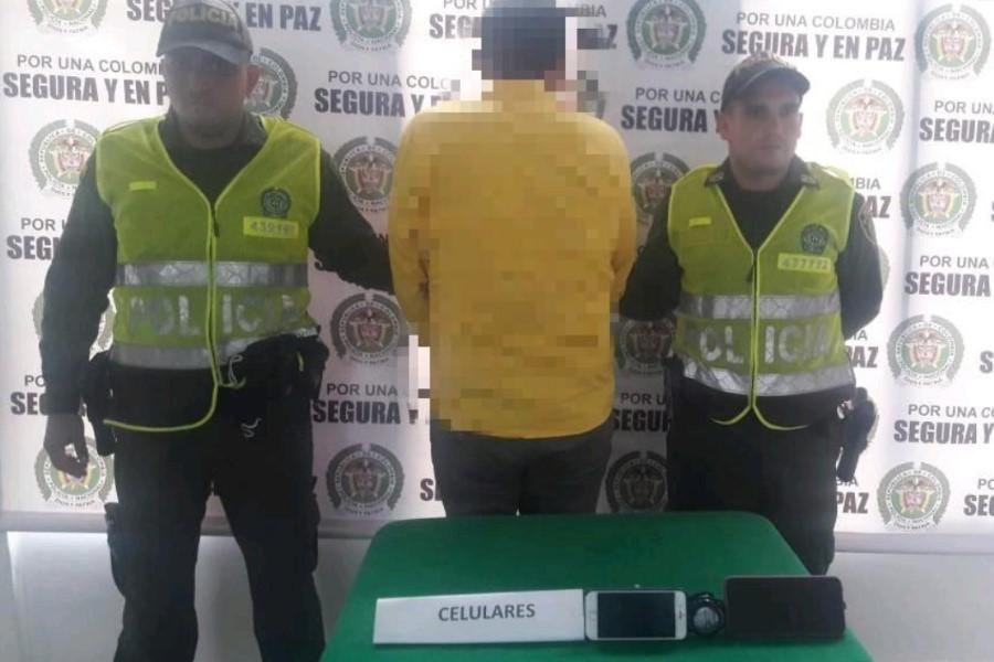 Fue así que solicitarlo para practicarle un registro personal, los uniformados hallaron en su poder dos equipos de telefonía celular marca iPhone, avaluados en 4 millones 500 mil pesos y un reloj avaluado en 350 mil, los cuales habían sido hurtados el día de 26 abril en el barrio Chircal del municipio de Suárez.