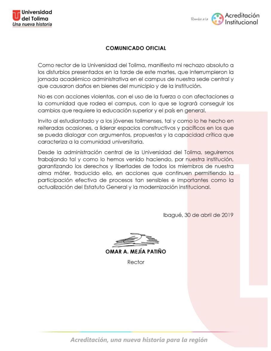 Luego de los fuertes disturbios que se presentaron en las últimas horas en las instalaciones de la Universidad del Tolima y sus alrededores, el rector Omar Mejía emitió un comunicado a través de la oficina de prensa de la institución, donde rechazó los actos vandálicos que dejaron significativos daños materiales.