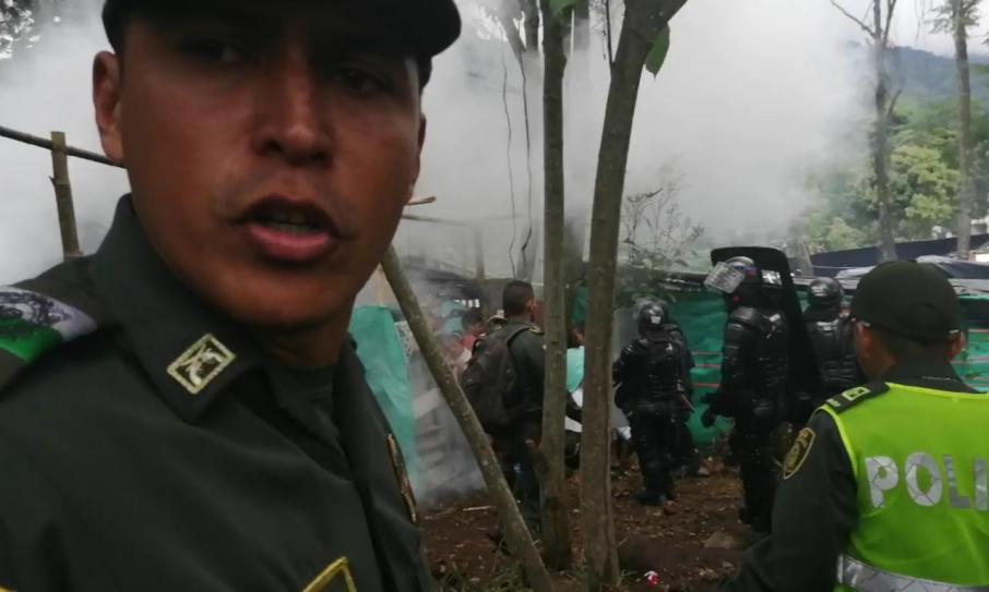 Pese a que en el lugar habían muchos niños, mujeres embarazadas y adultos mayores, el escuadrón móvil antidisturbios utilizó gases lacrimogenos y pistolas de paintball, para obligar a estas humildes familias a salir del lugar.
