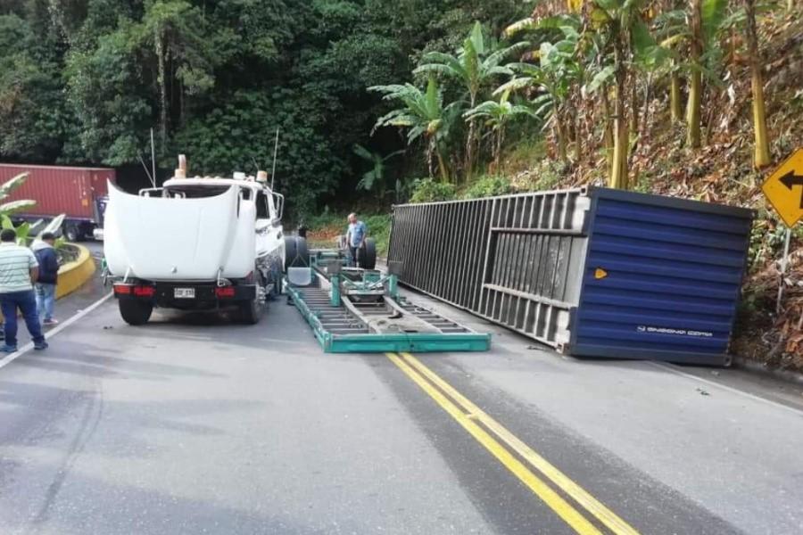 La emergencia se registró esta mañana sobre el kilometro 62 más 450 metros de la vía Ibagué - Cajamarca, donde un vehículo de carga pesada tipo tracto mula sufrió una falla mecánica, de tal forma que por el peso del container que transportaba terminó volcándose lateralmente sobre la carretera.