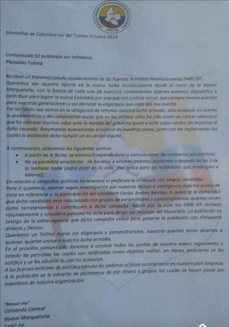 Vale la pena señalar que el más reciente panfleto se conoció en el municipio de Planadas, donde se advierte de la presencia de supuestas disidencias de las Farc, quienes además de pretender retomar el control de algunas zonas que manejaban a su antojo, también señalan que se van a realizar algunas actividades de limpieza social.