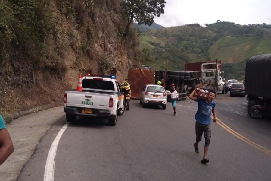 Pese a que el profesional del volante intentó maniobrar, el peso de la carga hizo que el vehículo perdiera estabilidad y terminara ocupando las dos calzadas. Así las cosas, por el momento permanece incomunicado el centro con el occidente del país.