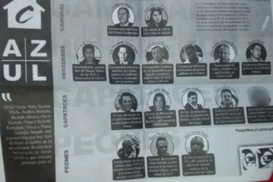 De igual forma, en el documento se realizó un organigrama donde se dividen las líneas políticas en gamonales, herederos, capataces y peones, dejando en esta última línea al actual rector de la UT Omar Mejía Patiño.