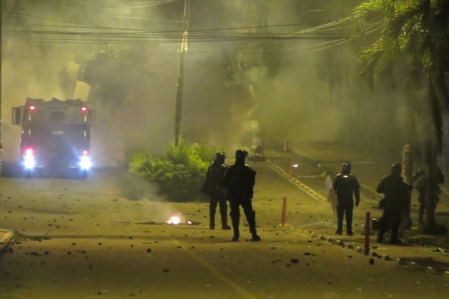 Vale la pena señalar que inicialmente la fuerza publica se mantuvo alejada del alma mater evitando confrontaciones con los encapuchados, sin embargo, al no tener con quien enfrentarse, los jovenes decidieron arremeter contra los uniformados que estaban desviando el flujo de vehículos.
