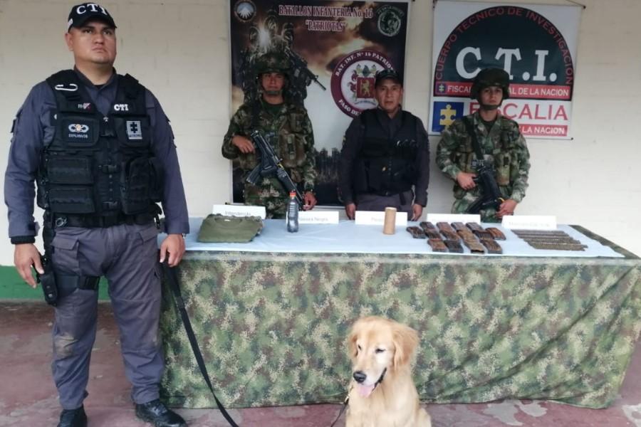 En el sector fue hallado material de guerra, conformado por 14 proovedores para fusil calibre 5.56 mm, 175 cartuchos para el mismo calibre, una barra de pentolita, una granada mk2 americana (destruida en el lugar de los hechos), un recipiente con un producto similar a la pólvora negra, además material de intendencia de uso exclusivo de las Fuerzas Militares.