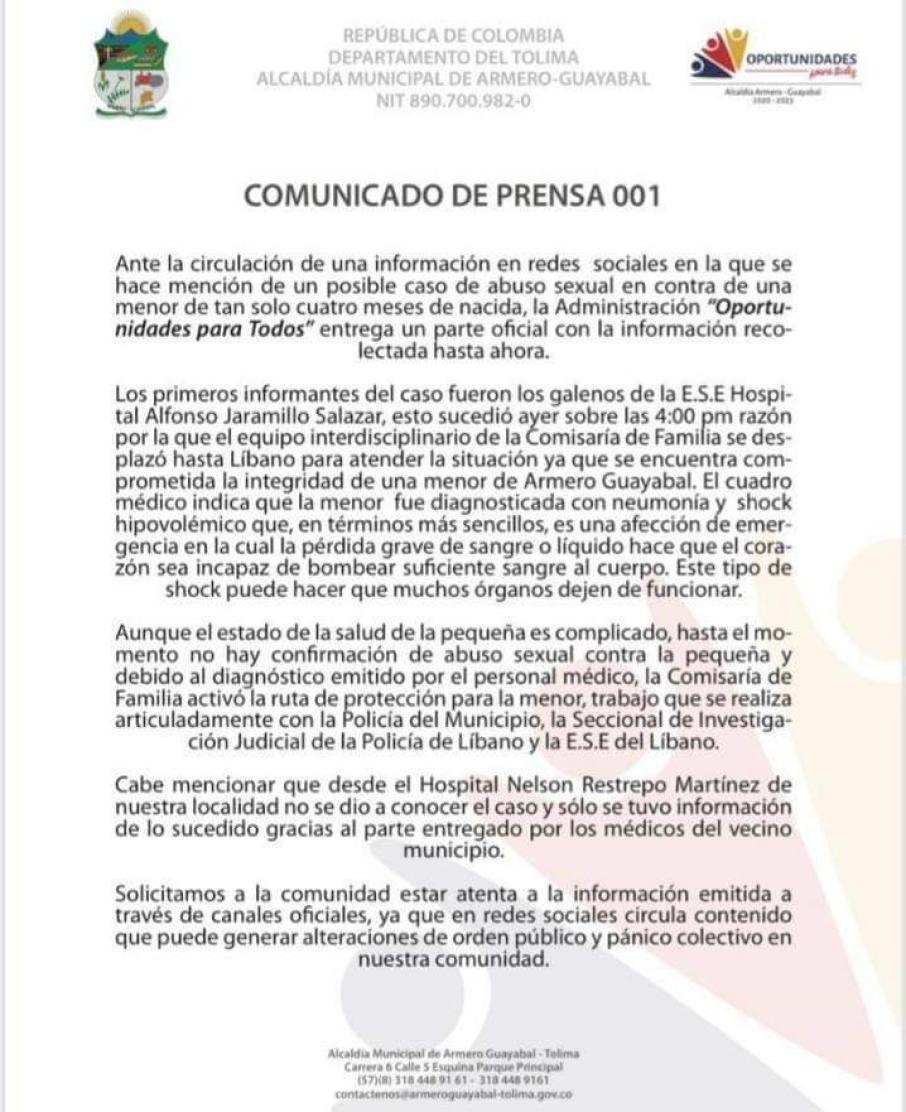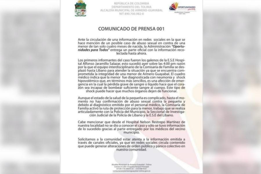 Por lo anterior, las autoridades del municipio de Armero Guayabal emitieron un comunicado oficial mientras avanzan las labores investigativas.