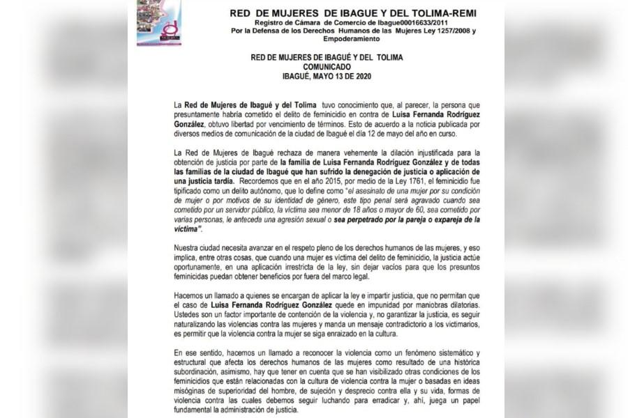 Teniendo en cuenta la indignación y frustración de una familia ibaguereña, tras la decisión de la justicia colombiana de dejar en libertad por vencimiento de términos a un hombre acusado de la conducta punible de feminicidio, la Red de Mujeres del Tolima decidió pronunciarse.