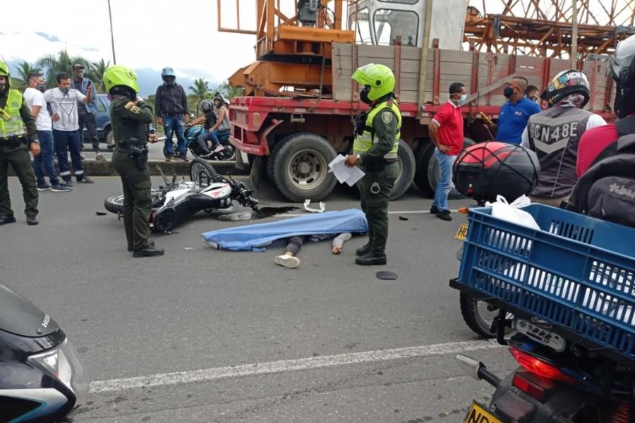 El caso se registró hace contados minutos en la vía que de Picaleña conduce hacia el sector de Mirolindo, donde el conductor de una motocicleta blanca de placas SER-55E se estrellara con un vehículo tipo tracto mula, la cual cargaba en su planchón una grúa utilizada en la construcción de edificaciones altas.
