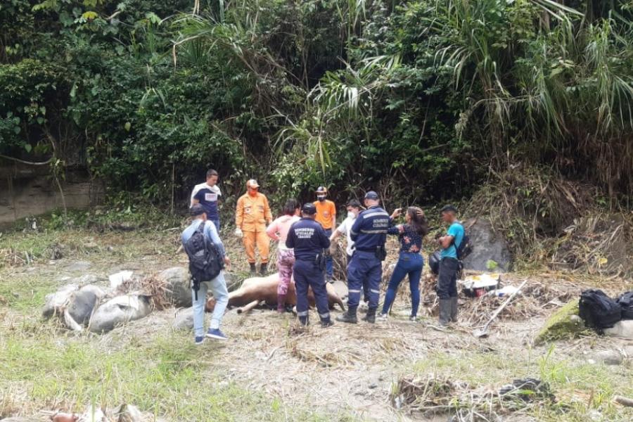 La emergencia fue reportada a las autoridades la noche anterior, luego que un semoviente cayera varios metros desde un barranco, generando que sufriera varios golpes y lesiones hasta aterrizar a orillas del río Combeima.
