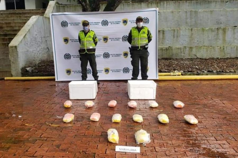 Fue así que al adelantar el proceso de inspección a la carga que transportaba el vehículo de placas SZP-628, los uniformados hallaron en dos cajas de icopor varios paquetes en cuyo interior habían camuflado 14 kilos de marihuana de alta calidad.