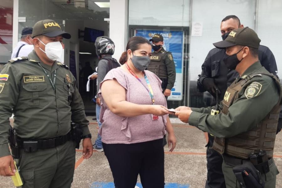 * Evite retirar y consignar altas sumas de dinero en efectivo. Las entidades financieras ofrecen opciones de transferencias y pagos electrónicos sin necesidad de desplazarse hasta la sucursal, recuerde que estas transacciones pueden ser realizadas a través de los cajeros automáticos, call center, Internet y banca móvil. Si definitivamente es necesario el retiro de efectivo, solicite el acompañamiento de la Policía Nacional.