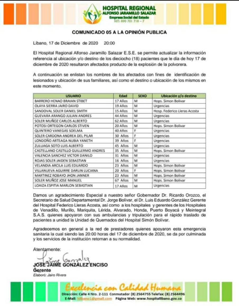 Hasta el Hospital Alfonso Jaramillo Salazar se desplazó un equipo de Defensoría de Familia del Centro Zonal Líbano donde se encuentran los adolescentes de 15, 16 y 17 años, quienes resultaron heridos por la explosión.