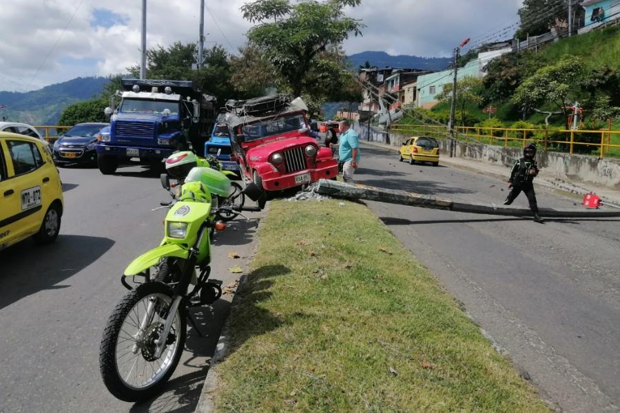 Así las cosas, el chofer decidió montar su automotor al separador, colisionando fuertemente contra un poste de alumbrado público, el cual terminó derribado, no sin antes tumbar otro poste al ser halado por las cuerdas que conducen la energía.