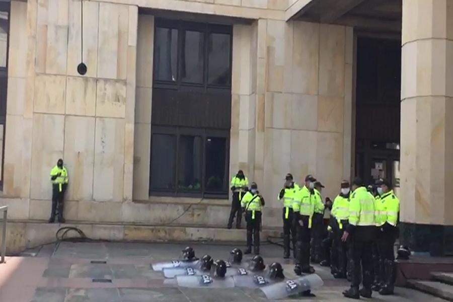 Con base a ello, las Fuerzas Militares han reforzado la seguridad en las afueras del Palacio de Justicia, aumentando la presencia de uniformados y personal del Escuadrón Móvil Antidisturbios - ESMAD con la finalidad de proteger la integridad y la vida de los transeúntes y las personas que se encuentran dentro del recinto.