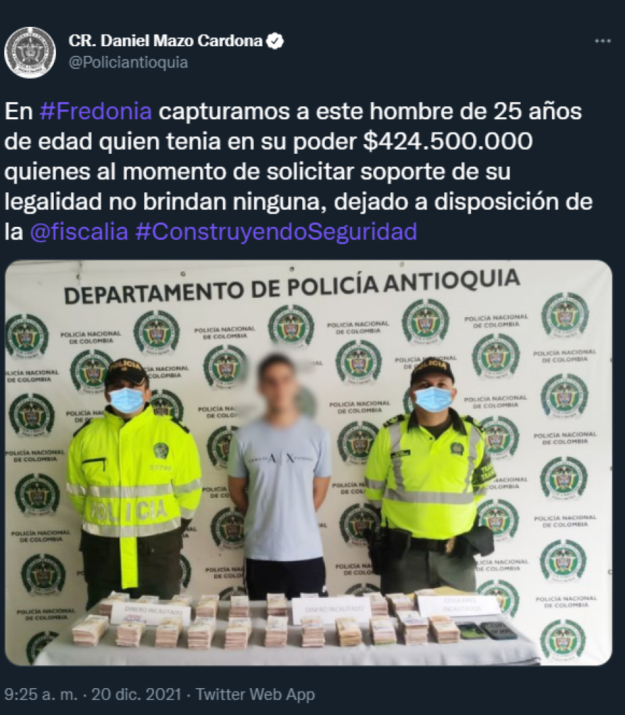 A través de la cuenta oficial de Twitter del Departamento de Policía de Antioquia fue compartida una imagen en la que se anunciaba la captura de un sujeto, acto que sería normal sino hubiese tenido una visible falla. La fotografía que se convirtió en objeto de burlas y memes, se hizo viral teniendo en cuenta que el Photoshop no fue utilizado adecuadamente y dejó al descubierto que los dos uniformados estaban incumpliendo los protocolos de bioseguridad, ya que no portaban su tapabocas.