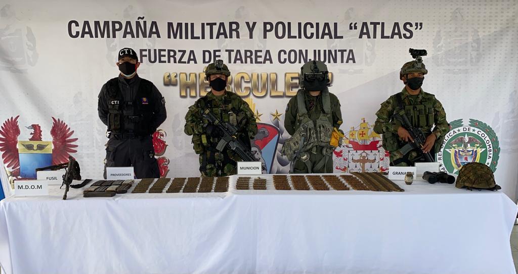 En el lugar de los hechos se logró la incautación de unos binoculares, un fusil, una granada de mano, proveedores, abundante munición e intendencia de uso privativo de las Fuerzas Militares, asimismo el material interceptado fue puesto a disposición del Cuerpo técnico de Investigación de la Fiscalía General de la Nación.