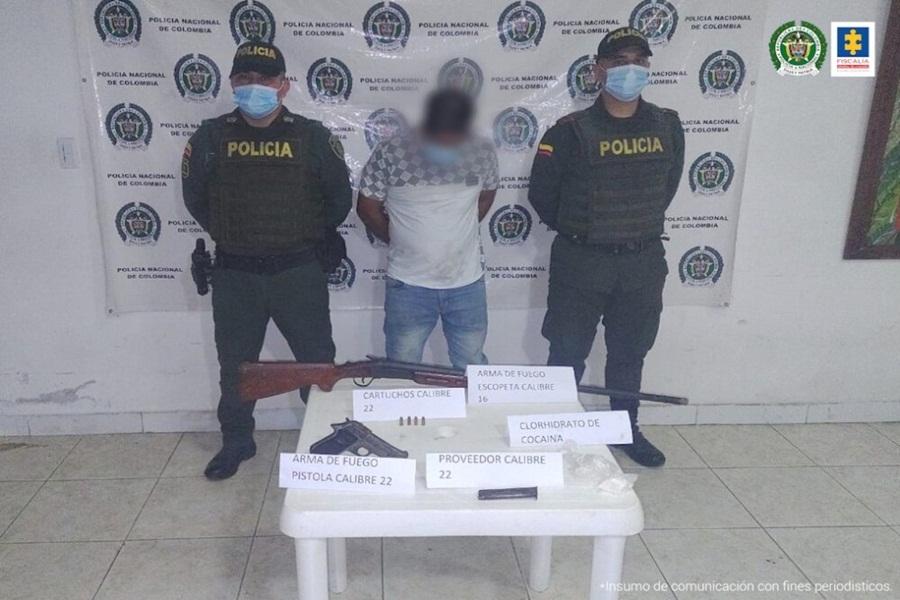 “Los policías encontraron en el lugar una pistola, proveedor, cartuchos, una escopeta, y dos bolsas plásticas con 46.9 gramos de clorhidrato de cocaína, presuntamente de propiedad del hoy judicializado”, aseguró el ente investigador.