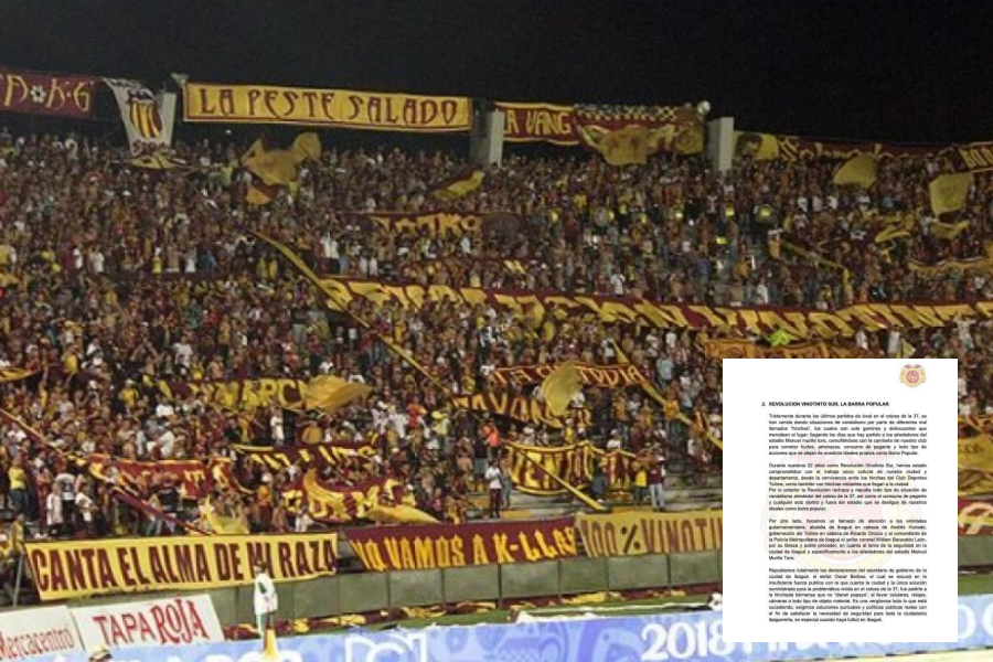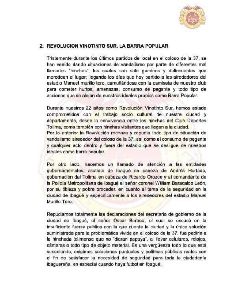 "Repudiamos totalmente las declaraciones del secretario de Gobierno de la ciudad de Ibagué, el señor Óscar Berbeo, el cual se excusó en la insuficiente fuerza pública con la que cuenta la ciudad y la única solución suministrada para la problemática vivida en el coloso de la 37, fue pedirle a la hinchada tolimense que 'no de papaya', al llevar celulares, relojes o cámaras".