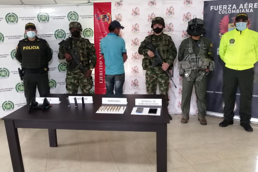 El hombre fue capturado en flagrancia en la vereda La Primavera del municipio tolimense de Rioblanco, en un trabajo articulado entre las diferentes instituciones, mientras tenía en su poder dos pistolas, varios proveedores y cartuchos calibre 9 milímetros.