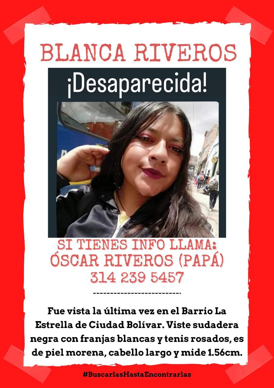 Son más de 20 días que lleva desaparecida una niña de nombre Blanca Yisela Riveros de 16 años, quien el pasado 21 de agosto se desapareció como por arte de magia del barrio La Estrella de la localidad de Ciudad Bolívar al sur de la capital.