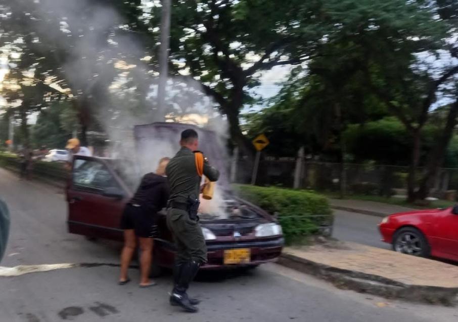 De inmediato los uniformados realizan señal de pare para auxiliar a las personas evacuándolos del vehículo, desplazándose hasta la patrulla policial con el fin de sacar el extintor, logrando abrir el capo del rodante, donde posteriormente fue apagado el automotor.